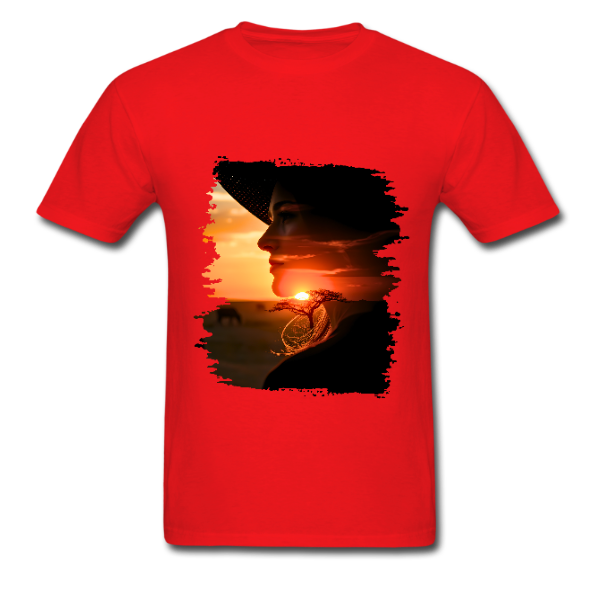 A double exposure design featuring a woman and an African sunset.