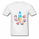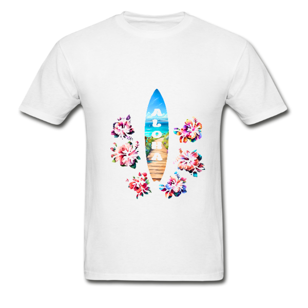 The front print features a vertical surfboard revealing a layered beach scene with the word “Aloha” tucked inside, surrounded by delicate hibiscus blooms. It reads like a postcard from a quiet Hawaiian morning — playful, sunlit, and calm.