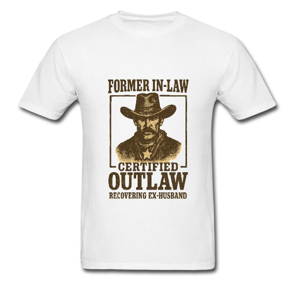 A bold, rugged design with a vintage outlaw feel, featuring a tough, no-nonsense character and the words “Former In-Law – Certified Outlaw – Recovering Ex-Husband.” Perfect for anyone who’s survived the wild west of relationships and wears their freedom with pride.